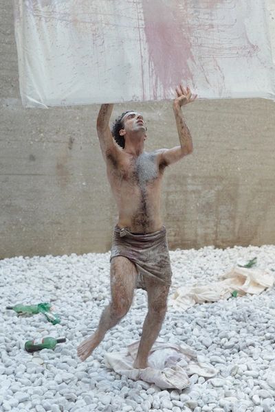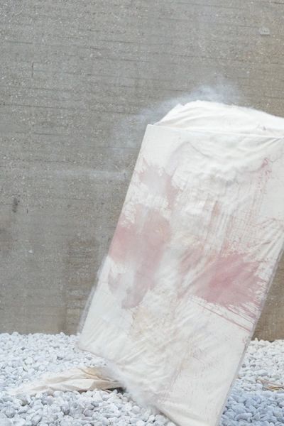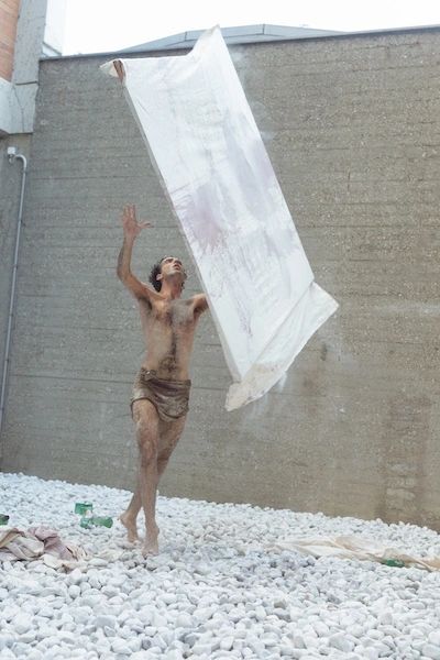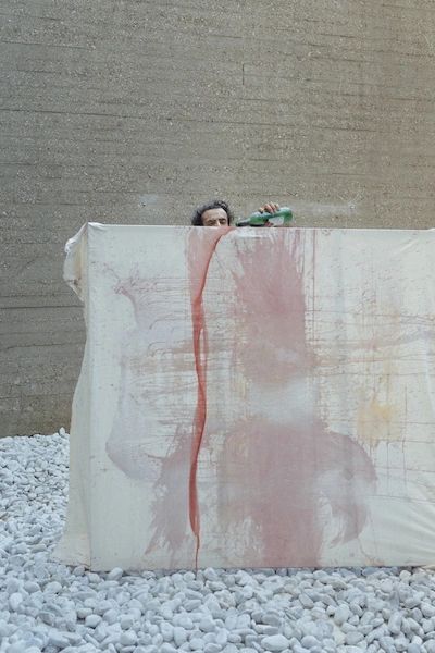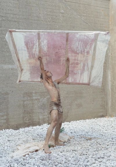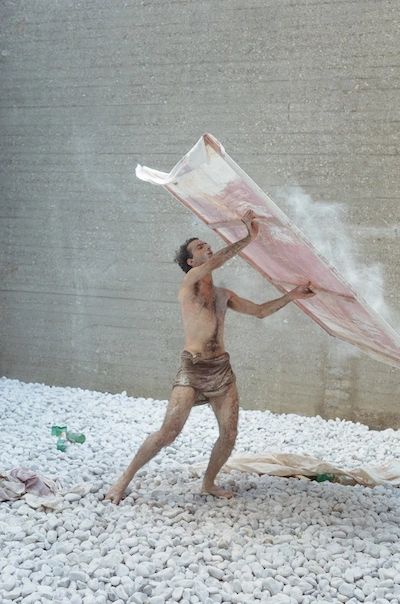 A Performance study of 'veil layering' conducted at the inner atrium of the University of Applied Arts, Vienna (Austria) in 2019. An impromptu choreography of pure and uncompromised liquids (water, wine, honey, flour), a collective of different textural archaic elements were being applied onto the canvas. leaving their traces in the air which were then attached onto the body through an immediate gestural language. The piece focuses on the sensual exchange of mediums and interaction of the body and stretched canvas to its absolute demolition. anthropomorphising the stretcher transformed in the narrative of human relationships.